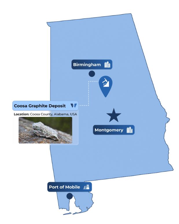 The Coosa Graphite Deposit, located in Coosa County, is the largest natural flake graphite deposit in the contiguous United States and spans approximately 41,965 acres. Coosa’s addition to the FAST-41 Dashboard reflects its important role in building a domestic supply of graphite, a critical mineral used in batteries, energy storage and industrial applications.